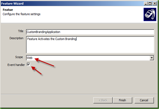 - Provide appropriate details in the Feature Wizard Dialogue. Ensure the feature is scoped at the ‘Web’ level and the Event handler option is checked. Click ‘Finish’
